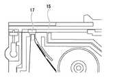 また、図11及び図12に示してあるように、スライダー15は、先端側(各図における左側)が上下動可能なように形成された撓み部15cを備えている。この撓み部15cの先端側の下面には、封止用ゴム17が取り付けられている。撓み部15cの位置及び形状と封止用ゴム17の形状は、図13に示してあるように、少なくとも、スライダー15が待機位置に位置しているときに、封止用ゴム17がセンサカートリッジ30のポート部(センサ取出口35とフィルム回収口36とそれらの間の側壁とからなる部分)上に位置するように、定められ、撓み部15c及び封止用ゴム17により、センサ取出口35とフィルム回収口36が閉じられ、待機状態において、カートリッジ30の開口部(ポート部)を封止する。尚、封止用ゴム17の形状は、平板状であっても良いが、センサカートリッジ30のポート部の形状と同じ形状又は類似した形状であることが好ましい。  Further, as shown in FIGS. 11 and 12, the