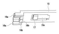 さらに、筐体10の内面の、待機位置に位置しているスライダー15の突出部15dと対向する部分には、突出部15dを、センサカートリッジ30のポート部方向に押し下げるための付勢手段(図14では、板バネ)72が設けられている。既に説明したように、突出部15dの裏側には、封止用ゴム17が設けられている。従って、スライダー15が待機位置に位置している場合、センサカートリッジ30のポート部が封止用ゴム17により封止されることになる。なお、撓み部15cがセンサカートリッジ30の開口部(ポート部)に密着するようにしっかり押し下げられる場合には、封止用ゴム17は用いなくてもよい。  Further, on a portion of the inner surface of the