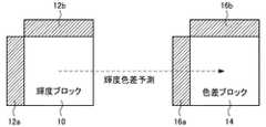 図18に示すように、輝度色差イントラ予測は、輝度ブロック10の符号化・復号化済の周辺画素12a、12bと、色差ブロック14の符号化・復号化済の周辺画素16a、16bとの間の相関度合いに基づいて行われる。輝度色差イントラ予測は、色差信号を予測するものであるから、相関度合いを算出する対象となる周辺画素は、符号化・復号化対象の色差ブロックの周辺画素を基準にして規定される。すなわち、色差ブロックに対して決まる周辺画素と同一位置にある輝度ブロックの周辺画素が相関度合いの算出の対象となる。  As shown in FIG. 18, the luminance / chrominance intra prediction is performed between the encoded / decoded