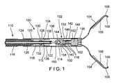 図1に示されているように、本発明の例示的な実施形態による装置100は、たとえば、内視鏡の動作経路を通して、治療対象の目標組織に向かって生体の中へ挿入可能な遠位部102を備える。装置は、身体を通る曲がりくねった経路を横断すること、たとえば、生体の開口を経由してアクセスされた生体の内腔を通して挿入される内視鏡の動作経路を通過することを許容する十分な可撓性を有する。遠位部102は、カプセル106の長手方向チャネル122の中に摺動可能に受け入れられた一対のクリップ・アーム104を含む。クリップ・アーム104は、当該クリップ・アーム104の遠位端部108が目標組織を受け入れるように相互に離間する開配置と、当該クリップ・アーム104の遠位端部108が目標組織を把持するために相互に向き合う閉配置との間で移動可能である。遠位部102は、装置100の近位部110に解放可能に連結されており、前記近位部110は、身体の外側に残留し、当該遠位部102が配置される際にユーザが操作可能なハンドル(図示せず)を含む。クリップ・アーム104は、カプセル106の中に延びる制御部材112によって、開配置と閉配置との間で移動可能である。制御部材112の近位端部は、ハンドルに設けたアクチュエータに連結される。本実施形態において、制御部材112の遠位端部114は、クリップ・アーム104の近位端部116に連結される。また、制御部材112の近位端部は、より詳細に下記に説明するように、目標組織にエネルギーを供給するために、制御部材112を介してクリップ・アーム104に電流を供給するエネルギー供給源に接続されていてもよい。 As shown in FIG. 1, a