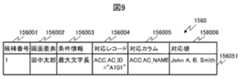 図9は、条件対応候補レコード群情報156の例を示す図である。条件対応候補レコード群情報156のテーブル1560はカラムとして、候補番号156001と、画面要素156002と、条件情報156003と、対応レコード156004と、対応カラム156005と、対応値156006とを有する。またテーブル1560はレコード156051を有する。各情報については、図14を用いて後で説明する。  FIG. 9 is a diagram showing an example of condition-corresponding candidate