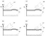 図4は、タッチパネル及び触覚UIにおけるユーザ入力とタッチセンサ101の検出閾値との関係を示した図であり、触覚UIの断面構成を示している。図4(a)は凸形状に変形していない場所における、ユーザ入力が検出されない状態を示し、図4(b)は凸形状に変形していない場所における、ユーザ入力が検出される状態を示している。同様に、図4(c)は凸形状に変形した場所における、ユーザ入力が検出されない状態を示し、図4(d)は凸形状に変形した場所における、ユーザ入力が検出される状態を示している。図1及び図3で説明した内容と同様の構成要素は、同一符号で示し、説明を省略する。 FIG. 4 is a diagram showing a relationship between a user input on the touch panel and the tactile UI and a detection threshold value of the