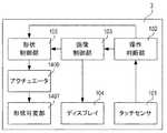形状制御部105は操作判断部102により判断したユーザ操作、及び画像制御部103により制御される画像位置に応じて、形状可変部107のアクチュエータ106を制御する。アクチュエータ106は形状可変部107の形状を変化させる動力部であり、形状可変部107はタッチディスプレイとともに構成され、タッチディスプレイ上に凸部を形成するための部材である。詳細については後述する。 The