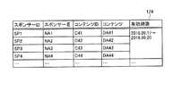 ここで、図6に実施形態にかかるスポンサーコンテンツ記憶部124の一例を示す。図6の例では、スポンサーコンテンツ記憶部124は、「スポンサーID」、「コンテンツID」、「スポンサー名」、「コンテンツ」、「有効期限」といった項目を有する。  Here, FIG. 6 illustrates an example of the sponsor