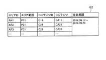 ここで、図4に実施形態にかかる位置対応コンテンツ記憶部122の一例を示す。図4の例では、位置対応コンテンツ記憶部122は、「エリアID」、「エリア範囲」、「コンテンツID」、「コンテンツ」、「有効期限」といった項目を有する。以下、各項目について、図1の例に則して説明する。  Here, FIG. 4 shows an example of the position-corresponding