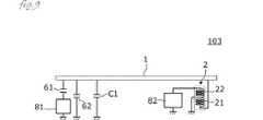 または、上記第2周波数帯を利用するNFC用給電回路は、実用上の出力を高めるため、コイルアンテナを接続する出力部は差動回路(平衡回路)で構成されることが多い。一方、上記第1周波数帯を利用する、例えば基地局との通信のための放射素子は、モノポール型アンテナを変形させたものが多く、等価回路上は不平衡回路である。そのため、NFC用給電回路を放射素子に接続すると、平衡回路と不平衡回路との間で不要なリーク電流が流れる等の問題が生じる。そのため、平衡・不平衡変換回路(バラン)を設けて、この平衡・不平衡変換回路を介して、放射素子とNFC用給電回路との間を電気的に接続することが有効である。 Alternatively, in the NFC power supply circuit that uses the second frequency band, the output section that connects the coil antenna is often configured by a differential circuit (balanced circuit) in order to increase the practical output. On the other hand, many radiating elements that utilize the above-mentioned first frequency band, for example, for communication with a base station, are modifications of a monopole antenna, and are equivalently unbalanced circuits. Therefore, when the NFC power supply circuit is connected to the radiating element, there arises a problem that an unnecessary leak current flows between the balanced circuit and the unbalanced circuit. Therefore, it is effective to provide a balanced/unbalanced conversion circuit (balun) and electrically connect the radiating element and the NFC power supply circuit through the balanced/unbalanced conversion circuit.