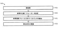 図4Aに示すように、多様なソフトウェアベースの処理段階140が示される。初め、血管造影画像のうちの1つ又は複数のフレームを、多様な検出段階及び追跡段階の前の前処理段階140a中に処理して、OCT、IVUS等及びこれらの組み合わせ等の別の撮像技術を用いて得られる他の画像データと係るフレームとの重ね合わせ登録を支援する。次の段階は、血管中心線の決定又は計算の段階140bである。図3のユーザインタフェースに示すように、血管中心線は、1つ又は複数のソフトウェアモジュールによって生成され、血管造影画像に対して重畳される、又はその他の様式で表示される。  As shown in FIG. 4A, various software-based processing stages 140 are shown. Initially, one or more frames of the angiographic image are processed during a