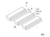 複数の透光性部材32は、全て同じ形状、同じ寸法に構成されている。そのため、一対の透光性部材32とハーフミラー31からなる組を複数貼り合わせると、複数のハーフミラー31は、互いに平行に配置された形態となる。図4および図5では図示を省略するが、ハーフミラー31の一方の面と隣り合う透光性部材32との間には、接着材層が設けられている。これにより、光学素子30は、全体として矩形板状の部材となる。透光性部材32の入射面32aもしくは射出面32bの法線方向から光学素子30を見ると、細い帯状の複数のハーフミラー31がストライプ状に並べられた構造となる。すなわち、光学素子30は、矩形状のハーフミラー31が平行導光体22の延びる方向、すなわちX方向に所定の間隔(ピッチPT)をおいて複数配列された構成を有する。  The plurality of