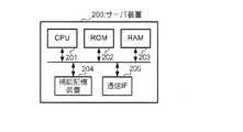 図3は、地域別笑顔度算出装置としてのサーバ装置200のハードウェア構成を例示するブロック図である。サーバ装置200は、CPU201、ROM202、RAM203、補助記憶装置204、及び通信IF205を有するコンピュータ装置である。CPU201は、各種の演算を行うプロセッサである。ROM202は、例えばサーバ装置200の起動に用いられるプログラム及びデータを記憶した不揮発性メモリである。RAM203は、CPU201がプログラムを実行する際のワークエリアとして機能する揮発性メモリある。補助記憶装置204は、例えばHDD又はSSDなどの不揮発性の記憶装置であり、サーバ装置200において用いられるプログラム及びデータを記憶する。CPU201がこのプログラムを実行することにより、後述する図4に示される機能が実現される。通信IF205は、所定の通信規格に従ってネットワーク900を介した通信を行うためのインタフェースである。サーバ装置200は、図3に例示した構成以外に、例えば表示部や操作部などの他の構成を含んでいてもよい。  FIG. 3 is a block diagram illustrating a hardware configuration of the