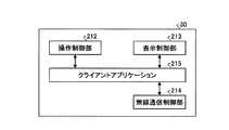 図11は、情報端末30が有する機能(情報端末30のCPU201によって実行される機能)の一例を示す図である。説明の便宜上、図11では、本実施形態に関する機能を主に例示しているが、情報端末30が有する機能は、これらに限られるものではない。図11に示すように、情報端末30は、操作制御部212、表示制御部213、無線通信制御部214、クライアントアプリケーション215を有する。操作制御部212は、操作部207を介して入力された操作信号を取得し、クライアントアプリケーション215等の情報端末30において動作するモジュールに入力する。操作制御部212は、ユーザによる操作を受け付ける機能を有していると考えることもできる。表示制御部213は、「表示制御手段」の一例であり、クライアントアプリケーション215のGUI(Graphical User Interface)等、情報端末30に関する各種の情報を表示部206に表示する制御を行う。無線通信制御部214は、無線通信I/F208を介して他の機器との通信を制御する。例えば無線通信制御部214は、無線通信I/F208を介して入力される情報を取得すると共に、他の機器に対して送信すべき情報を、無線通信I/F208を介して送信する。 FIG. 11 is a diagram showing an example of functions of the information terminal 30 (functions executed by the