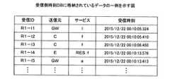 図7は受信側時刻DB123に格納されているデータの一例を示す図である。受信側時刻DB123は一のサービスの実行を指示する指示命令又は指示命令に対する応答を示す応答命令を受信した受信時刻を記憶するデータベースである。受信側時刻DB123は受信ID列、送信元列、サービス列及び受信時刻列を備える。受信ID列には受信時刻を識別するための受信IDが記憶される。送信元列には指示命令又は応答命令を受信した情報処理装置4又はゲートウェイ2の名称が記憶される。サービス列には情報処理装置4が実行するサービスの名称及び応答を待つサービスが存在するか否かを示す応答情報が記憶される。応答情報は例えば、「RES:」である。また、送信元列の「GW」は例えばゲートウェイ2を示す。送信元列の「C」又は「E」等は例えば情報処理装置4C又は4E等を示す。 FIG. 7 is a diagram showing an example of data stored in the receiving