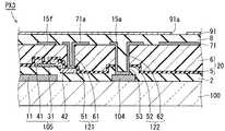 ドレイン電極42は画素PX1の各々に配置されている。ドレイン電極42は、チャネル層31の他方端部上に接しており、ソース電極41から離れている。チャネル層31のうちソース電極41とドレイン電極42との間の部分が、TFT105のチャネル領域として機能する。  The