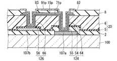 本実施の形態においては、額縁領域102において、ゲート絶縁膜2にはコンタクトホール55が設けられており、保護絶縁膜5にはコンタクトホール54およびコンタクトホール56が設けられており、平坦化膜6にはコンタクトホール64およびコンタクトホール66が設けられている。コンタクトホール64とコンタクトホール54とコンタクトホール55とがつながることによって、絶縁膜20およびゲート絶縁膜2を貫通する外部ゲートコンタクトホール124(第1のコンタクトホール)が構成されている。コンタクトホール66とコンタクトホール56とがつながることによって、絶縁膜20を貫通する外部ソースコンタクトホール126(第2のコンタクトホール)が構成されている。  In the present embodiment, in the