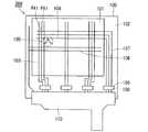 なお、共通電極91(図3)と画素電極71(図4)とが重畳された領域が、画素PX1を単位とした表示に用いられる領域、つまり画素表示領域151(図3)、である。カラーフィルタ基板300(図1)が有する遮光膜(ブラックマトリックス)は、平面視において、画素表示領域151に対応する領域に開口部を有する。また、共通電極91は複数の画素PX1に跨っていることで、共通配線106(図2)としての機能も有している。  The region on which the common electrode 91 (FIG. 3) and the pixel electrode 71 (FIG. 4) are superimposed is a region used for display in units of the pixel PX 1, that is, the pixel display region 151 (FIG. 3). The light-shielding film (black matrix) included in the color filter substrate 300 (FIG. 1) has an opening in a region corresponding to the