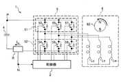 不図示の直流電源が供給する直流電圧は、正極ノードPと負極ノードNとの間に接続された平滑コンデンサ4によって平滑化されて、インバータモジュール5に印加される。直流/交流変換器であるインバータモジュール5は、制御器2(マイコン)によって制御され、擬似的な三相交流電圧が出力される。この三相交流電圧により圧縮機モータ6に電流が流れ、この圧縮機モータ6を駆動する。  The DC voltage supplied by the DC power supply (not shown) is smoothed by the
