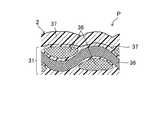 これに対し、本実施形態に係る成形用材料1を用いた成形方法により得られた繊維強化樹脂成形品Pは、図5に示すように、金型の成形面に接する最外層2の第2熱硬化性樹脂材料20が、内側の繊維強化樹脂層の第1熱硬化性樹脂材料37よりも早く硬化することにより、表面に所定方向に配向した強化繊維の凹凸が現れず、表面平滑性及び外観性に優れた繊維強化樹脂成形品Pとなる。  On the other hand, the fiber-reinforced resin molded product P obtained by the molding method using the