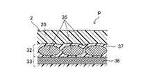 図6に、従来の成形用材料として、最外層2に、マトリクスの第1熱硬化性樹脂材料37のシートを用いて、硬化させた場合の繊維強化樹脂成形品Pの模式的な断面図を示す。この場合、硬化工程S3及び冷却工程S4における第1熱硬化性樹脂材料37の収縮率(30〜50×10−6/℃)と所定方向に配向した強化繊維36の収縮率(−0.3×10−6/℃)との差が大きいため、所定方向に配向した強化繊維36の繊維束の凹凸が繊維強化樹脂成形品Pの表面に現れ、外観性が損なわれる。なお、最外層2を設けず、CFRP層3のみを成形した場合も同様である。FIG. 6 shows a schematic cross-sectional view of a fiber-reinforced resin molded product P when cured by using a sheet of the first