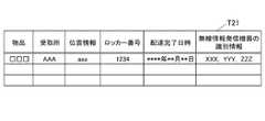通知内容管理テーブルT21には、配達依頼毎に、物品、受取所、位置情報、ロッカー番号、配達完了日時、無線情報発信機器の識別情報等が対応付けられて格納される。