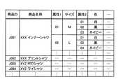 例えば、属性1「01」はサイズ「M」に対応し、属性1「02」はサイズ「L」に対応する。また、例えば、属性2「01」は色「白」に対応し、属性2「02」は色「黒」に対応し、属性2「03」は色「ネイビー」に対応する。  For example,