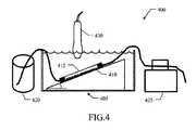 セットアップ400は、(滑動する)フローセル405を含む。フローセル405は、ヒトP−セレクチンFcで被覆されたガラスプレート410と、音響透過性のマイラーフィルム415からなる上壁とからなる底壁を有するチャンバによって形成される。フローセル405をセットアップ400に設置する前に、ガラスプレート410上にセレクチン標的化マイクロバブル(MB)を含む(標的化された)造影剤をインキュベートして、その上に固定化したままにした。蠕動ポンプ425を用いて、BR38マイクロバブル(1・105バブル/mL)を含む(標的化されていない)造影剤をフローセル405を通ってリザーバ420から循環させた。このようにして、固定化造影剤が循環造影剤によって取り囲まれた試験管内条件が模倣される。フローセル405(固定化造影剤と循環造影剤の両方を含む)の原画像は、CPS造影剤特異的モードの線形トランスデューサ15L8を備えたSequoia512からなる超音波スキャナ430を用いて5つの異なる位置で取得した。超音波スキャナ430のイメージング設定は、MI0.08、深さ25mm、焦点15mmおよび17mm、フレームレート4Hzであった。超音波スキャナ430によって提供されたデータは、DICOMシーケンスとしてエクスポートされた。対数圧縮されたビデオデータは、較正ファイル15L8,83dB、PP4、デルタ2、+1/M:2(V1.1)を使用して造影剤の局所濃度に比例するエコーパワー信号を提供する画素レベルで線形化された。分析結果はXLSファイルとして格納された。同じ操作を4つの異なるバージョンのガラスプレート410で繰り返し、それぞれが2つの異なる濃度の(標的化された)造影剤をインキュベートし、その結果、固定化造影剤の8つの異なる表面密度(3.3〜97.5・106>μm2/mL)を得た。固定化造影剤の表面密度は、そのマイクロバブル(平均5カ所)を光学的に計数することによって決定された。