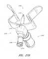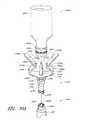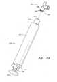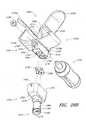 第1の端部キャップ部材405は、略錐台形のものとすることができ、かつその中に中央開口471を有することができる。組み立て時に、プランジャ474は、中央開口471を通って延在する。蓋473が、中央開口471の内部に向けて延在することができる。蓋473は、第1の端部キャップ部材405を第2の端部キャップ部材409に固定するために、プランジャ474の基部と第2の端部キャップ部材409におけるディスク部476との間に形成されたチャネル475へと収容することができる。蓋473および対応するチャネル475は、第1の端部キャップ部材405を第2の端部キャップ部材409に対して長手軸線方向の周囲で回転可能にすることができる。したがって、第1の端部キャップ部材405および第2の端部キャップ部材409は、端部キャップ406を形成するよう連結可能である。  The first