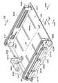 次に図8および11を参照すると、積載ベイ200は、フレーム200Fおよびフレーム200Fに取り付けられたピッキングフェイス支持表面200S(図11に示されず)を含んでいる。フレーム200Fは、2つのエフェクタキャリッジ200G1、200G2が、矢印297の方向に走行するように取り付けられた、対向するチャネル200C1、200C2を画定する。図12Aおよび12Bも参照すると、各エフェクタキャリッジ(全体的にはエフェクタキャリッジ200G)は、両側端部200GE1、200GE2に設置されたガイドホイールキャリッジ200RCを有するフレーム200GFを含んでいる。各ガイドホイールキャリッジ200RCは、矢印298、299の方向における移動からエフェクタキャリッジ200Gの移動を安定させるために、チャネル200Cの1つまたは複数の壁に係合するように構成された、1つまたは複数のガイドホイール200GP1A〜200GP1Dを含んでいる。たとえば、図11Aを参照すると、各ガイドホイールキャリッジ200RCは、矢印298の方向におけるエフェクタキャリッジ200Gの移動を安定させるために(および方向299と略平行である軸の周りの、エフェクタキャリッジ200Gの捩じり動作TM3を実質的に排除するために)それぞれのチャネル200Cの対向する側面200CS1、200CS2に係合する1つまたは複数のガイドホイール、および矢印299方向におけるエフェクタキャリッジ200Gの移動を安定させるために、それぞれのチャネル200Cの他の壁200CS3に係合する1つまたは複数のガイドホイールを含んでいる。矢印298の方向と略平行である軸の周りの、エフェクタキャリッジ200Gの捩れ動作TM4は、キャリッジ803に関する上記のものと実質的に類似の方法で、(上記のものと実質的に類似の)ワイヤロープリービングによって、実質的に排除され、ワイヤロープリービングはワイヤ200W1、200W2およびフレーム200GFに取り付けられたプーリ200P1〜200P4を含み、ワイヤ200W1、200W2の端部200WEがたとえば、積載ベッドのフレーム200F、またはローバー110の他の任意の適切な部分に留められる、あるいは固定される。各エフェクタキャリッジは、それぞれのエフェクタキャリッジ200Gを駆動ベルト260DBに固定するための、駆動ベルト連結部材200GBAも含んでいる。フレーム260Fに取り付けられたモータ260Dは、エフェクタキャリッジ200G1、200G2を互いに向けて、および互いから離れるように移動させるために、(プーリ260DP1、260DP2とともにフレーム200Fに取り付けられた)駆動ベルト260DBを駆動させ、一方のエフェクタキャリッジ200G1は、(プーリ260DP1、260DP2の周りで輪になる)駆動ベルト260DBの上部260DBTに取り付けられており、他方のエフェクタキャリッジ200G2は、駆動ベルト260DPループの底部260DBBに取り付けられている。エフェクタキャリッジ200G1、200G2の位置はそれらの走行の範囲の間において無制限である。積載ベイ200の長さおよび幅は、任意の適切な長さおよび幅を有するピッキングフェイスを支持するようにサイズ決めされてもよく、エフェクタキャリッジ200G1、200G2は様々なサイズのピッキングフェイスを収容するように調節される。理解できるように、伸縮アーム802A、802Bがキャリッジ200G1、200G2のそれぞれ1つに取り付けられるように、1つまたは複数のアーム取付け台200Mが各エフェクタキャリッジ200G1、200G2に固定される。アーム取付け台200Mは、ピッキングフェイス支持表面200Sに形成された溝または開口200SA内を進行するように、積載ベイ200のピッキングフェイス支持表面200Sを通過して延在する。他の態様では、1つまたは複数のピッキングフェイスがフレーム110Fおよび/またはピッキングフェイス保持位置に対し、矢印297の方向に位置調整されるように、各エフェクタキャリッジ200G1、200G2は、上記のものに類似の方法で、他のエフェクタキャリッジから独立して移動可能である。たとえば、この態様では、エフェクタキャリッジ200G1、200G2の一方は、モータ260Dによる矢印297の方向における移動のために、駆動ベルト260DBに連結される。他方のエフェクタキャリッジ200G1、200G2は、(モータ260Dに実質的に類似である)第2のモータ260D2による矢印297の方向における移動のために、(上記のものに実質的に類似の方法で)第2の駆動ベルト260DB2に連結される。ここで、1つまたは複数の伸縮アーム802A、802Bを移動させることによってピッキングフェイスが矢印297の方向に位置調整され得るように、各エフェクタキャリッジ、および、したがって各伸縮アーム802A、802Bは、独立して移動可能であり、および共に移動可能である。  Next, referring to FIGS. 8 and 11, the