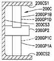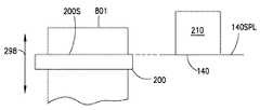 次に図2Cおよび図2Dを参照すると、フィンガ250が対向する配列では、たとえば、アーム220A、220Bが保管棚140内に伸長されるとき、フィンガは、保管棚140の支持表面140Sの間に位置する。たとえば、ある態様では、保管棚140は、エンドエフェクタ200Eの伸長および収縮の方向299と略垂直な(たとえば、交差する)方向297(図2A)に延在する、互いに離間した支持表面140Sを含んでいる。保管棚140に挿入されたときに、フィンガ250が、エンドエフェクタ200Eの伸長軸299を交差する方向に、棚構造物(たとえば、支持表面140S)に挟みこまれるように、たとえば、支持表面140S間のピッチP1(図2A)は、たとえば、フィンガ250間のピッチP2(図3A)に実質的に類似であるが、他の態様では、フィンガ間の間隔は、フィンガが支持表面の間の隙間を通過することを可能にする、任意の適切な間隔である。  Next, referring to FIGS. 2C and 2D, in an arrangement in which the