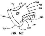 次に特に図99〜図103を参照すると、レトラクタ724と組み合わせて用いられるシールド700が示されている。レトラクタ724は、図18および図19を参照して説明したのと同一のレトラクタ62である。レトラクタ724は、可撓性側壁730によって互いに連結された第1のリング726と第2のリング728を有する。側壁730は、レトラクタ724の長手方向軸線に沿って延びる中央開口部を画定する。第2のリング728を圧縮して膣管中に通して挿入することができ、膣管中において、第2のリングは、拡張して膣に対する固定手段を形成する。第1のリング726は、患者の体外で膣の入口の上方に位置し、この入口のところで、第1のリングをそれ自体回しながら下げると、膣管をレトラクトするとともに拡張することができる。  Next, with particular reference to FIGS. 99-103, the