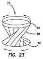 図71Aに示されているシールド200の垂直方向拡張形態は、シールド200が螺旋状モールド220上に成形された結果である。シールド200は、シールド200の中心が位置する長手方向軸線218を定める。シールド200は、少なくとも一部が垂直方向拡張位置に向かって付勢される材料で作られている。シールド200は、形状記憶材料で作られても良く、あるいは形状記憶材料で作られた部分を有しても良い。垂直方向圧縮形態にあるとき、垂直方向拡張形態へのバイアスの結果として、シールド200がばね作用で垂直方向拡張形態になることはなく、その理由は、外面の陥凹が頂部フランジ222とも呼ばれる頂部リップおよび底部フランジ224とも呼ばれる底部リップを形成するからであり、その結果、頂部フランジ222の少なくとも一部分は、圧縮形態にある間、隣接のオーバーラップ状態の頂部フランジ222に当接し、底部フランジ224の少なくとも一部分は、圧縮形態にある間、隣接のオーバーラップ状態の底部フランジ224に当接し、それにより、垂直方向圧縮形態が垂直方向拡張形態に容易にひょいと動くのが阻止される。頂部フランジ222および底部フランジ224のうちの少なくとも一方は、シールド200が拡張して圧縮形態から拡張形態になるのを阻止する停止部としての役目を果たす。拡張形態に向かうバイアスにより、幾分かの摩擦力が器具それ自体に及ぼされ、かかる摩擦力は、シールド200の側方寸法または直径方向拡張を調節するのを助ける。圧縮形態にあるとき、シールド200は、長手方向軸線回りに巻かれ/カールされるのが良く、それにより直径方向または側方寸法を減少させることができ、それによりシールド200の寸法を減少させるとともに中央ルーメン216の直径を減少させ、それにより小さな低侵襲性切開創または体口を通る挿入を容易にする。  The vertically expanded form of the