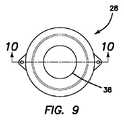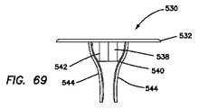 次に図68〜図70を参照すると、本発明の別の変形例としてのシールド530が示されている。シールド530は、軟質または半硬質プラスチックで作られている。シールド530は、実質的に扁平であるフランジ532を有するとともに中間部に設けられた開口部534を有している。開口部534から見て、複数のスリット536が開口部534の周囲からフランジ532中に外方に延び、それによりコーナー交差部の可撓性が増大している。フランジ532は、レトラクタが用いられる場合レトラクタ内に嵌まり込むよう寸法決めされるとともに形作られている。具体的に言えば、フランジ532は、シールド530を定位置に保持するのを助けるようレトラクタの頂部リングの下にスナップ装着される。  Next, referring to FIGS. 68 to 70, a