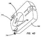 次に図40および図41を参照すると、安定器100は、電動式細切器24に連結された状態で示されている。図40および図41のシステムは、細切器24に設けられていて安定器100の中央部分104内の爪(図示せず)と係合するよう構成された歯付きバーを含むラチェット駆動機構体を有する。ボタン114が爪から離れたり爪に係合したりするよう安定器100に設けられており、その目的は、安定器100を細切器24からロック解除したりこれにロックしてこれらの相対的垂直並進を自由にしまたは阻止することにある。細切器24は、一体形スコープおよび照明器116、送気ポート118および細切器ブレード122を回転させる機械式駆動連結部120を有する。安定器100は、上述したように、袋、レトラクタまたはガードに係合するよう外方に延びる下側フランジ102を有している。一変形例では、安定器100は、安定器の爪が歯付きバー112の或る特定の範囲内に位置し、それにより安全シャットオフ機構体を提供している場合に細切器24の作動が阻止されるよう構成され、その結果、細切器24は、遠すぎまたはガードの範囲を超え、従って、袋との偶発的な接触を生じさせる恐れのある位置にあるときに作動されないようになっている。安定器100の別の変形例が図42および図43に示されており、この場合、同一の符号は、同一の部分を示すために用いられている。安定器100は、異なる形状を有し、爪要素122が図43に見える。  Next, referring to FIGS. 40 and 41, the