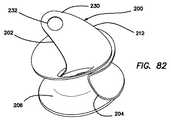 図82を参照すると、フィンガープルまたはタブ230を備えたシールド200の変形例が示されている。タブ230は、シールド200の第1の内側端部202のところでまたはこの近くで一体成形された状態で示されている。タブ230は、第1の内側端部202およびシールド200の頂端部212から延び、ユーザの指によるか器械、例えば把持器によるかのいずれかでユーザにより容易に把持されるようになった延長部を形成している。一変形例では、タブ230は、器械またはフィンガーの挿入場所を提供するよう構成された孔232を有する。別の変形例では、孔232は設けられない。タブ230は、これを全体として上方にまたは近位側の方向に引くと、シールド200が非拡張形態から拡張形態に変わるよう構成されている。タブ230を介して第1の端部202のところに加えられる上向きの力の結果として、第1の端部202の底部フランジ224は、シールド200の隣接の下側フランジ224から外れまたは離脱し、それにより第1の端部202を隣接のシールド200の部分のオーバーラップ曲率を備えた嵌合位置から離隔させる。タブ230の近位端部が上方に引かれているとき、これによりシールド200の垂直方向拡張が生じ、第1に、その結果として、第1の内側端部202が非拡張形態から離脱し、シールド200の残部が徐々に非拡張形態の嵌合並置状態から出て拡張形態にあるシールド200の渦巻き形状になる。図82は、非拡張形態にあるシールド200およびシールド200と一体に形成されたタブ230を示している。別の変形例では、タブ230は、接着剤、ステープルまたは他の締結具によってシールド200の第1の端部202に取り付けられた別個の要素である。さらに別の変形例では、タブ230は、シールド200に取り付けられたテザーを有し、別の変形例では、タブ230は、テザーであり、シールド200の延長部ではない。  Referring to FIG. 82, a modification of the