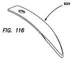 図52および図53は、螺旋の形をした成形モールド220のコアピン状の渦巻き状シールド200を示している。渦巻き状シールド200を射出成形によって製造するため、シールド200を螺旋モールド220上に成形する。モールド220のコアピンをいったん巻き戻すと、一端部を隣接の巻線の前または後ろに押し込むことによってシールド200をその機能発揮渦巻き形態にすることができる。シールド200は、当初螺旋状に形成され、次に、渦巻き状にされるので、シールド200は、その中に幾分かのスプリングバック張力記憶作用を有し、それにより、シールド200は、完全な渦巻き状のままでいることなく、螺旋形状を取ろうとする。シールド200が望ましくなくかつ過剰の量のスプリングバイアス張力を有する場合、シールド200を適当な温度で割り当てられた時間をかけてオーブン内に配置することによってアニーリングプロセスを実施するのが良く、次にこれを取り出し、それによりシールド200内の残留張力を減少させまたはなくす。しかしながら、シールド200の一変形例では、幾分かの残りの張力が有利には望ましく、その理由は、シールド200が長手方向軸線に沿って拡張する傾向により切開創部位からの器具の取り出しが容易になるからである。タブ(図示せず)がシールド200の一端部、例えば近位端部、内側端部または外側端部上に形成されるのが良くかつ/あるいは穴がシールドの一端部の近くに形成されるのが良く、引きひもをこの穴に通して取り付けることができ、その結果、医師がこのひもまたはタブを引いてシールド200を切開創部位から容易に取り出すことができる。タブまたは穴は、シールドを挿入する上での方向上の優先度を指示することができ、その結果、タブ/穴が患者の体外で外科医の近くに位置した状態で器具を取り出す際に螺旋張力を利用することができるようになっている。一変形例では、巻線の内側に同形化される第1の内側端部202にはこの取り出し特徴のためにタブが設けられまたは穴が設けられる。取り出し中、内側端部202を垂直方向に引くと、シールドのバンドは、次第に伸びて切開創部位から出る。  52 and 53 show a core pin-shaped