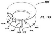 次に図51〜図53を参照すると、本発明のガードまたはシールド200の別の変形例が示されている。ガード200は、全体として渦巻きの形をしている。ガード200は、第1の内側端部202および第2の外側端部204を有する。第1の端部202と第2の端部204は、リーフまたはバンドとも呼ばれる中央部分206によって互いに連結されている。ガード200は、後続端部または近位端部とも呼ばれる頂端部212、先導端部または遠位端部とも呼ばれる底端部214ならびに第1の内側端部202および第2の外側端部204によって互いに連結された内面208と外面210を有する。中央部分206またはバンドは、凹状の外面210を有し、内面208は、渦巻きの内部から見て凸状である同形面を形成する。バンドの陥凹は、一変形例では放物線であり、変曲点は、頂端部212と底端部214との中間に位置し、ただし本発明は、これには限定されず、変曲点は、頂端部212と底端部214との間のどこかの場所に位置していても良く、それどころか頂端部212または底端部214と一致しまたはほぼ一致していても良い。バンド206は、陥凹を備えなくても良く、バンド206は、頂端部212と底端部214との間でガード200の少なくとも一部分に沿って単に湾曲していても良くあるいは真っ直ぐであっても良い。ガード200は、底端部と同一の外径を有する頂端部を有するものとして対称であるものとして示されている。別の変形例では、ガード200は、形状が非対称であり、このガードは、底端部に対して直径が大きいまたは小さい頂端部を有しても良い。ガード200はまた、垂直方向に対称であるが、本発明はこれには限定されず、ガード200は、基準水平面に対して角度をなしている中心軸線を有しても良い。ガード200は、バンドの一部分が湾曲し、円形のまたは楕円形の状態でバンドの別の部分とオーバーラップするよう渦巻き形状を有する。具体的に言えば、バンド200の外面210の少なくとも一部分は、バンド200の内面の少なくとも一部分とオーバーラップするとともにこれに向いていて、バンド200の一部の陥凹がバンドの別の部分の陥凹に隣接して位置しまたは並置し、バンドの一部分をバンドの他の部分内に嵌入して嵌め込んでいる。渦巻き体は、円周方向長さが約3πRである1回と半分のターンを有する休止しかつ機械的にストレスの受けていない形態を有するものとして示されており、この場合Rは、ガード200の長手方向軸線に垂直にとった半径である。本発明は、正確に1.5のターンを有するガードには限定されず、特定の切開創サイズについてその寸法、形状および所望の力分布状態ならびに機能、例えばレトラクタ機能および/または保持機能に従って所望通りにこれよりも多いまたは少ないターンを有しても良い。渦巻き状ガード200の特定の利点は、その形状および寸法を変更することができ、拡大することができまたは縮小することができるということにある。本質的には、バンドは、それ自体に対して滑ることができ、それにより大きな直径を有する大径の渦巻き形態または小さい直径を有する小径の渦巻き形態を形成することができる。渦巻き状ガード200は、渦巻き体によって形成された中央ルーメン216を有し、渦巻き体を拡張しまたは開くと、この渦巻き体を拡大することもできる。中央ルーメン216の寸法もまた、渦巻き体を閉じまたはバンドをそれ自体多数のターンを生じさせる緊密なカールの状態にまたはこれに対して少数のターンを有する大きな直径を生じさせる大きなカールの状態に滑らせることによって螺旋の寸法を減少させると縮小可能である。中央ルーメン216は、実質的に形状が円形であるが、本発明は、これには限定されず、中央ルーメン216は、形状が楕円形であっても良くまたは不定であっても良い。したがって、渦巻き状シールド200は、患者の創部もしくは切開創または上述した患者の体内に配置された袋中に他のガードとともに挿入されると、調節可能である。切開創の寸法に応じて、渦巻き形状を開きまたは閉じることによって渦巻き状シールド200を、大きくまたは小さく調節することができ、ガードをそれ自体カールさせることにより多くのターンを形成し、それにより創部開口部または袋にそれに応じて適合させることができる。さらに、渦巻き状シールド200を特定の休止または通常の直径方向位置、形状および寸法に関して所定のバイアスを備えた状態で成形できる。例えば、約1インチ(2.54cm)の切開創が患者に作られる場合、約2インチ(5.08cm)の休止直径を有する渦巻き状シールド200の寸法は、渦巻き状シールド200をそれ自体ねじってその巻き数をそれ自体増大させ、それによりその直径を減少させることによって減少可能である。縮小形態にある間、渦巻き状シールド200を1インチ(2.54cm)の切開創中に挿入し、次に放出する。これに対して、バイアスが渦巻き状シールド200中に成形されているので、渦巻き状シールド200は、その通常の形態に向かう傾向があり、従ってその縮小形態から拡張