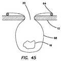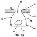 図48および図49は、第1のリング64、第2のリング66、第1のリングと第2のリングとの間の側壁68および基部72を有する別の袋変形例を示している。袋18の底部のところに配置された弾性の第2のリング66により、袋は、体腔12内に配置されると、ラッパ状に広がって開き、また、かかる弾性の第2のリングは、物体が検体16にくっつくのを阻止するのを助ける。検体を袋18内に入れた後、第1のリング64を図49に示されているように腹壁10の表面まで引く。  48 and 49 show another bag variant having a