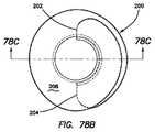 次に図71Aおよび図71Bを参照すると、シールド200がそれぞれ拡張された細長い形態および圧縮されまたは非拡張状態の形態で示されている。シールド200の拡張形態は、図72〜図74にも詳細に示されている。シールド200は、拡張形態では、内面208を外面210上にオーバーラップさせることによって圧縮形態に変換可能である。シールド200の圧縮形態が図76〜図79にも示されている。シールド200の少なくとも一部分は、図78A〜図78Cに明確に示されているように非拡張形態においてそれ自体オーバーラップしている。図78Cでは、シールド200の隣接のオーバーラップ部分の外面210の陥凹内へのシールド200の一部分の嵌合状態が示されている。シールド200は、少なくとも一部が長手方向軸線218周りに巻かれまたはカールされるようになっている。シールド200は、少なくとも一部が長手方向軸線218周りにそれ自体の上に巻かれまたはカールされるようになっており、その結果、シールド200の一部分は、シールド200の別の部分とオーバーラップしまたはこれと並置状態でまたはこれと接触関係をなして位置するようになっている。図71Bの非拡張形態にあるとき、シールド200は、非拡張形態が創部または体口中への挿入に適した減少直径または側方寸法を有する密なロールの状態に巻かれたコンパクトな形態に加えて、弛緩したまたは通常の側方形態を有する。シールド200は、弛緩したまたは通常の側方形態に向かうバイアスを有し、このシールドは、創部または体口中への挿入後にこのバイアスに向かう傾向があり、それによりシールド200がシールド200に用いられる材料および挿入状態のシールド200に応答して周囲の組織により及ぼされる力に応じて、拡張してコンパクトな形態から大きな形態になるときに幾分かのレトラクション力を組織に及ぼす。創部または体口がきつい場合、シールド200は、その減少側方挿入形態から拡張しなくても良く、あるいは、シールドがその通常の弛緩形態に向かう傾向があるので側方寸法だけが僅かに拡張しても良く、それにより僅かに巻き出、あるいは、シールド200は、その通常の弛緩形態に完全に拡張しても良い。  Next, with reference to FIGS. 71A and 71B, the