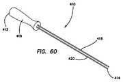 図60〜図63を参照すると、袋導入器またはフォーク410が小さな切開創を通って収容袋310を患者の体腔内に導入するために用いられている。導入器410は、手術野中への袋310の配置を容易にする。フォーク410は、近位端部412および遠位端部414を有している。ハンドル416が近位端部412のところに設けられている。第1の枝部418および第2の枝部420がハンドル416から遠位側に延びて実質的にフォーク状の形態を形成している。枝部418,420は、等しい長さのものである。枝部418,420は、任意適当な断面を有することができ、これら枝部は、十分な距離だけ互いに間隔を置いて配置されている。枝部418,420は、ステンレス鋼で作られ、これら枝部は、図60に示されているように射出成形プラスチックまたは金属ハンドル416に連結されている。この設計例では、枝部418,420を有するスチールロッドが射出成形ハンドル416中に挿入されてこれに連結され、それにより小さな輪郭を備えたフォーク410の実現が可能であるが、このようにすることは、製作するのが高価でありかつ時間がかかる。図61では、フォーク410は、単一の材料片で作られ、この場合、ハンドル416と枝部418,420の両方は、一体形構造を形成するよう射出成形される。この設計例は、大きな輪郭および弱い設計という代償を払って、製造するのが最も容易でありかつ費用が最も安い。  With reference to FIGS. 60-63, a bag introducer or
