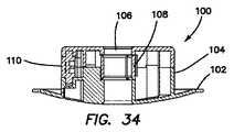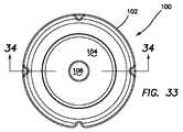 次に図32〜図39を参照して、以下において、安定器100について説明する。安定器100は、袋18,70またはガード28に結合するよう構成されたフランジ102を有する。安定器100は、ルーメン106を構成してロック108を収容する中央部分104を有する。ルーメン106は、電動式細切器24を受け入れるよう寸法決めされるとともに構成されている。ルーメン106中に挿入されると、腹壁に対する細切器24の高さを調節し、次に、細切器をロック108により定位置にロックするのが良い。ロック108は、レバー110が解除されて細切器24がルーメン106内で垂直に並進することができるようにするロック解除形態を有する。ロック108はまた、レバー110を押して細切器24の並進をロックするロック形態を更に有する。ロック108は、ロックを定位置に保持する細切器24のシャフトに対する摩擦力を増大させるよう働く。  Next, the