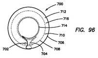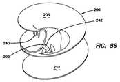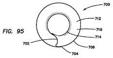 図80は、シールド200を周囲巻線の周長の約1.25倍を有する弛緩したまたは通常の側方形態で示しており、シールド内径またはルーメン内径226を備えた中央ルーメン216およびシールド直径228または外径を示しており、これらのうちのいずれかは、シールド200のための側方または直径方向寸法として役目を果たす。図81は、シールド200の平面図である。図81では、シールド200は、切開創/体口内への挿入に適したコンパクトな形態にあり、シールド200は、この切開創/体口を通って密なロールな状態にそれ自体巻かれる。図81のシールド200は、周囲巻線の周長の約2.25倍以上を有するとともに図80の弛緩した通常の形態に対して減少したルーメン直径226およびシールド直径228を有している。シールド200のオーバーラップ部分は、互いに接触しており、そして減少側方直径位置を僅かに摩擦の作用で保持するよう働いているが、側方寸法のバイアスが応力を受けていないまたは弛緩した半径方向通常形態に向かっているので、シールド200は、通常の形態になる傾向がある。減少側方寸法を備えたコンパクトな形態は、創部または体口中に適切に挿入されるようになっている。コンパクトな形態から、シールド200は、創部または体口の外部に位置したときに放出されると、拡張して減少側方寸法位置から通常の応力を受けていない側方寸法形態になる。現場でのこの拡張は、挿入状態のシールド200によって及ぼされる力に応答して組織によって及ぼされる力によって制限される場合がある。シールド200は、円形の形をしているとともに直径を有する中央ルーメン216を有しているが、本発明は、これらには限定されず、変形例は、幅よりも大きな長さを有する細長いルーメン216、例えば長円形または楕円形のルーメンを有するシールド200を含む。したがって、シールド200の外周は、対応の形状を有していても良く、あるいは有していなくても良い。シールド200の外周が中央ルーメン216の形状に一致した形状を有する変形例では、ルーメン216が円形である場合、シールド200の外周もまた円形であり、あるいは、中央ルーメン216が長円形または楕円形の形状を有している場合、シールドの外周もまた、長円形または楕円形の形状を有する。  FIG. 80 shows the