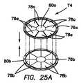 次に図25を参照すると、図18および図19に示されたレトラクタ62または図20〜図24の袋70と併用可能に構成されているガード74が示されている。ガード74は、剛性リング76を有し、複数の内方に延びるフラップ78が中心で出会い、または図25に示されているように中心に開口部80を形成する。フラップ78は、これらフラップがリング76に対して撓むようにリング76に取り付けられており、それにより、標的組織16を、フラップ78を越えて取り出すことができる。フラップ78はまた、遠位側に撓んでガードを越えて器械を挿入することができる。フラップ78は、ガード28の同種の材料、例えばポリカーボネート、LDPE、HDPEまたは類似の材料で作られており、従って、フラップ78は、十分に弾性であって耐切断性を示すとともにブレードによる穿通に抵抗し、それにより、レトラクタ62または袋70を保護する。ガード74は、フラップ78を備えた単一のリング76から成っていても良くあるいはフラップ78a,78bをそれぞれ備えた2つの類似のリング76a,76bで構成されても良い。2つのリング76a,76bは、フラップ78aがフラップ78bからオフセットしてフラップ78a,78b相互間の保護を可能にする層状フラップ構成体を形成するよう互いに連結されている。標的組織16は、開口部80a,80bを通って引き上げられ、ガード76の付近にあるとき、標的組織16が切断される。標的組織16はまた、フラップ78a,78bに当てて位置決めされた場合にも切断可能である。  Next, with reference to FIG. 25, a