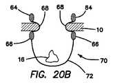 図20Aおよび図20Bは、袋70中に構成された改造型レトラクタ62を示している。袋70は、可撓性で実質的に円筒形の側壁68により互いに連結された第1のリング64と第2のリング66を有している。第2のリング66のところの開口部は、袋70の基部72を形成する垂下袋部分によって閉じられている。袋70を袋18に関して上述したのと同じ仕方で挿入して同じ仕方で用いる。第2のリング66を圧縮し、そしてこれを小さな切開創に通して腹腔12中に送り込む。側壁68を頂部リング64周りに巻いて開口部14をレトラクトするとともにこれを開き、第1のリング64に連結可能なガード24を袋70内の開口部のところで用いても良くあるいは用いなくても良い。検体16を上述したのと同じやり方で手動または電動式細切によって取り出す。第1のリング64もまた、ゲルキャップ44に連結可能である。  20A and 20B show a modified