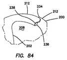 次に図83および図84を参照すると、ロック234を備えたシールド200が示されている。ロック234は、シールド200が非拡張形態にある間、シールド200の側方または直径方向寸法をロックするよう構成されている。シールド200が定位置に配置されているとき、周囲組織の力によりシールド200の側方または直径方向寸法が所望レベルよりも小さくなる場合がある。シールド200は、非拡張形態にある間、弛緩した通常の形態を有する場合があるが、シールド200の内蔵バイアスは、周囲の組織の力に打ち勝つには十分ではない場合があり、または特定の手技に関し、あるいは、中央ルーメン216に通されるべき特定の器械に関しあるいは標的組織の特に大きな検体に関して外科医の好みに至らない場合がある。いずれの場合においても、ロック234は、シールド200をロックしてその側方または直径方向寸法を実質的に固定された状態に保持し、そして特に、周囲組織からの力による側方または直径方向寸法の減少を阻止するよう構成されている。例えば、シールド200をシールド200の側方寸法よりも比較的小さい切開創または体口中に挿入されるべき場合、最初にシールド200を例えば図81に示されているコンパクトな形態に縮小する。コンパクトにされた形態にある間、シールド200を創部または体口中に挿入する。挿入状態のシールド200に応答した周囲組織の力は、シールド200を応力を受けていない弛緩状態の通常形態に戻す傾向のあるバイアスよりも大きいのが良い。かかる場合、外科医は、シールド200にとってまたは周囲組織をレトラクトするために大径の中央ルーメン216を要望する場合がある。次に、外科医は、シールド200を広げて大きな側方または大きな直径方向形態にし、そしてシールド200に向けられているロック234によりこの位置をロックする。一変形例では、ロック234は、シールド200の第1の内側端部202から見て近位側に或る距離を置いたところにかつ頂端部212の近くに配置された第1のノッチ236およびシールド200の第2の外側端部204から近位側に或る距離を置いたところにかつ頂端部212の近くに配置された第2のノッチ238を有する。ノッチ236,238は、シールド200の一端部202が非拡張形態においてシールド200の他端部204とオーバーラップした場所の近くに配置される。シールド200は、図83ではロック解除形態で示されている。シールド200をロックするため、シールド200を広げて大径中央ルーメン216を形成することによってシールド200を側方寸法について拡張する。第1のノッチ236を第2のノッチ238とオーバーラップさせてシールド200を固定された直径方向/側方寸法位置にロックし、シールド200の残部は、シールド200の周囲周りの円周方向の幾分かのオーバーラップ度を維持する。図84は、ロック形態において第2のノッチ238とオーバーラップしまたはインターロックした第1のノッチ236を示している。ロック形態にある間、第1の端部202の少なくとも一部分は、第2の端部204の少なくとも一部分の外部に位置し、その結果、第1のノッチ236の内面208の一部分が第2のノッチ238の外面210に向くようになる。シールド200をロック解除するため、ノッチ236,238を互いに外す。  Next, referring to FIGS. 83 and 84, a