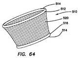 次に図64および図65を参照すると、本発明の別のシールド510が示されている。シールド510は、近位端部514のところに位置する第1のリング512および遠位端部518のところに位置する第2のリング516を有する。リング512,516は、互いに実質的に平行であり、側壁520によって互いに連結されている。側壁520は、軟質繊維またはポリマーで作ることができる織物シース材料である。この材料は、ケブラー(Kevlar(登録商標))、ダイニーマ(Dyneema(登録商標))、リップストップ(rip-stop)ナイロン、またはポリマー配合材料であるのが良い。側壁520は、リング512,516にヒートシールされまたは結合されている。第1および第2のリング512,516は、半剛性でありかつ通常の高プロフィールの大きな形態と圧縮された低プロフィールの細長い形態との間で圧縮可能である。リング512,516は、これらの通常の形態では全体として円形であるが、楕円形であっても良い。リング512,516を円形または大きな形態から長円形または小さな形態に圧縮することができ、その結果、シールド510を小さな切開創、特にシールドを保護するための収容袋の口中に挿入することができるようになっている。一変形例では、第2のリング516だけが切開創中に挿入できるよう圧縮可能であり、第1のリング512は、第1のリング512が患者の体内に対して外にまたは近位側に位置するように剛性である。剛性の近位側の第1のリング512は、細切のための大きなシールドまたは切断板としての役目を果たすために大きくかつ幅が広いのが良い。第2のまたは遠位側に配置されるリング516は、圧縮されて袋中に容易に挿入されるのに適した可撓性のものであり、第1のリング512よりも直径が僅かに小さいのが良い。  Next, with reference to FIGS. 64 and 65, another