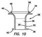 特に図55および図56を参照すると、リング314は、自由端部を互いに結合することによって円または他の形状に形作られるプラスチックの単一の細長い小片322で形成されている。別の変形例では、リング314は、2つまたは3つ以上の部品、例えば2つの半円で作られ、これら2つの半円は、一緒になって同一半径の円を構成する。端部は、互いに連結されておらず、袋310の口のところのスリーブ内で通常の湾曲した形態に保持される。多部品構成型リング314は、小さな形態へのリング314の圧縮を容易にする。リング314は、高さが約0.38インチ(9.65mm)、幅が0.18インチ(4.57mm)、長さが約38インチ(96.52cm)である。リング314を形成する材料の厚さは、約0.18インチ(4.57mm)である。  In particular, with reference to FIGS. 55 and 56, the