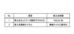 図10は、参入先が不明な状態の参入先情報の一例を示す図である。参入先が不明な状態は、例えば、通信端末1が、一度も参入処理を実施していない状態である。参入先が不明な状態では、図10に示すように、参入先のネットワークのネットワーク識別子である参入先ネットワーク識別子(PAN  ID)の参入先情報には、不明であることを示す0xffが格納され、対応する無線チャネルの番号を示す参入先無線チャネルの参入先情報にも、不明であることを示す0xfが格納される。制御部102は、参入先情報を参照し、ステップS38で参入処理に用いた参入先ネットワーク識別子と無線チャネル番号との少なくとも一方が参入先情報と異なっている場合には、参入先情報の更新が必要であると判断する。図11は、参入先が明白な状態の参入先情報の一例を示す図である。一度、参入処理に成功すれば、参入先情報は、参入処理に成功した際の情報に基づいて更新される。このように、一度、参入処理に成功しており参入先情報に不明であることを示す値以外の有効な値が格納されている状態を、参入先が明白な状態と呼ぶ。参入先が明白な状態では、参入先情報には、参入処理に成功した際の情報が格納される。図11は、PAN  ID  #BのSMネットワークBに無線チャネル番号#2を用いた参入処理が成功した後の参入先情報を示している。  FIG. 10 is a diagram showing an example of entry destination information in a state where the entry destination is unknown. The state in which the entry destination is unknown is, for example, a state in which the