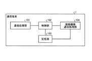 次に、各装置の構成例について説明する。図3は、本実施の形態の通信端末1の構成例を示す図である。図3に示すように、通信端末1は、通信処理部101、制御部102、記憶部103および接続機器通信処理部104を備える。また、図示を省略するが、通信端末1は、通信端末1を駆動する電池を備えてもよい。通信処理部101は、SM2との間で通信を行う。SM2との間の通信は、有線通信であっても無線通信であってもよい。通信処理部101は、通信方式に応じた通信を行うための通信回路を含む。SM2との間で無線通信を行う場合には、通信処理部101はアンテナを備える。制御部102は、通信端末1の動作を制御する。  Next, a configuration example of each device will be described. FIG. 3 is a diagram showing a configuration example of the