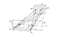 距離算出手段63は、既知の方法を用いて、カメラ51により撮像した画像、本実施形態では、カメラ51により撮像され画像補正部62によって補正された補正画像と、カメラ51間の距離とに基づいて物体(特徴点)の距離(深度)および三次元座標を計算する。すなわち、この距離算出手段63は、図5に示すように、例えばカメラ51の奥行きf、カメラ51とこのカメラ51により撮像された画像G1,G2の物体(特徴点)との距離(視差)、および、カメラ51間の距離lに基づく三角測量を応用し、カメラ51により撮像した各画像(画像補正部62(図1)によって処理された補正画像)中から同一位置を示す画素ドットを検出し、この画素ドットの上下方向、左右方向および前後方向の角度を計算して、これら角度とカメラ51間の距離とからその位置のカメラ51からの距離および高さを計算するとともに物体O(特徴点SP)の三次元座標を算出する。したがって、本実施形態において、複数のカメラ51により撮像する画像は、可能な限り範囲が重なって(ラップして)いることが好ましい。なお、この図1に示す距離算出手段63は、この計算した物体の距離を示す距離画像(視差画像)を作成してもよい。この距離画像の作成の際には、計算した各画素ドットの距離を、例えば1ドット毎などの所定ドット毎に明度、あるいは色調などの、視認により識別可能な階調に変換して表示することにより行われる。したがって、この距離画像は、いわば図2に示す電気掃除機11(本体ケース20)の走行方向前方のカメラ51によって撮像される範囲内に位置する物体の距離情報(距離データ)の集合体を可視化したものである。なお、特徴点は、図1に示す画像補正部62により補正された画像や距離画像に対して例えばエッジ検出などを行うことで抽出可能である。エッジ検出方法は、既知の任意の方法を用いることができる。  The distance calculation means 63 is based on an image captured by the