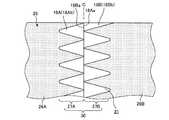 弱粘着部27の構成は、限定されない。弱粘着部27は、例えば図7に示すように、波形状を有する弱粘着部30としてもよい。弱粘着部30は、弱粘着部27と同様に第1領域27A及び第2領域27Bを有するが、その形状が異なる。すなわち、弱粘着部30の各領域27A,27Bは、折曲中心Cに沿って延びた波形状を有する。領域27A,27Bの波形状同士は、例えば0.5周期分だけ位相がずれた状態で隙間31を介して対向している。隙間31は、第1領域27Aと第2領域27Bとの間で粘着部材26が設けられていない領域である。従って、このような弱粘着部30においても、隙間31を有することで、単位面積当たりで見た場合の粘着力が粘着部26A,26Bよりも弱い。  The configuration of the weak