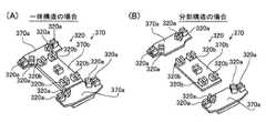 また、図17(A)(B)に示すように、基板部370aと基板部370bとは、一体構造を有していてもよいし、分割構造を有していてもよい。一体構造を有している場合、基板部370aと基板部370bとは、基板部370aと基板部370bとの間に段差部を有する1枚の回路基板の互いに異なる部分である。また、分割構造を有している場合、基板部370aと基板部370bとは、互いに独立した回路基板であり、基板部370aと基板部370bとの間に段差部を有するように互いに連結された状態で用いられる。  Further, as shown in FIGS. 17A and 17B, thesubstrate portion 370a and thesubstrate portion 370b may have an integral structure or a divided structure. When having an integral structure, thesubstrate portion 370a and thesubstrate portion 370b are different parts of one circuit board having a stepped portion between thesubstrate portion 370a and thesubstrate portion 370b. Further, when having a divided structure, thesubstrate portion 370a and thesubstrate portion 370b are circuit boards that are independent of each other, and are connected to each other so as to have a stepped portion between thesubstrate portion 370a and thesubstrate portion 370b. Used in the state.