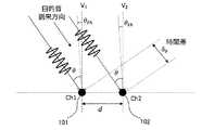 第1のマイクロホン101及び第2のマイクロホン102で集音された音声が、目的音か妨害音かを判別するには、第1のマイクロホン101及び第2のマイクロホン102からの信号を用いて音声到来方向が所望の範囲であるかどうかを推定する必要がある。ここで、第1のマイクロホン101及び第2のマイクロホン102からの信号間に生じる時間差は、角度θによって決まるため、この時間差を利用することで到来方向の推定が可能となる。以下、図2及び図3を用いて説明する。  In order to determine whether the sound collected by the
